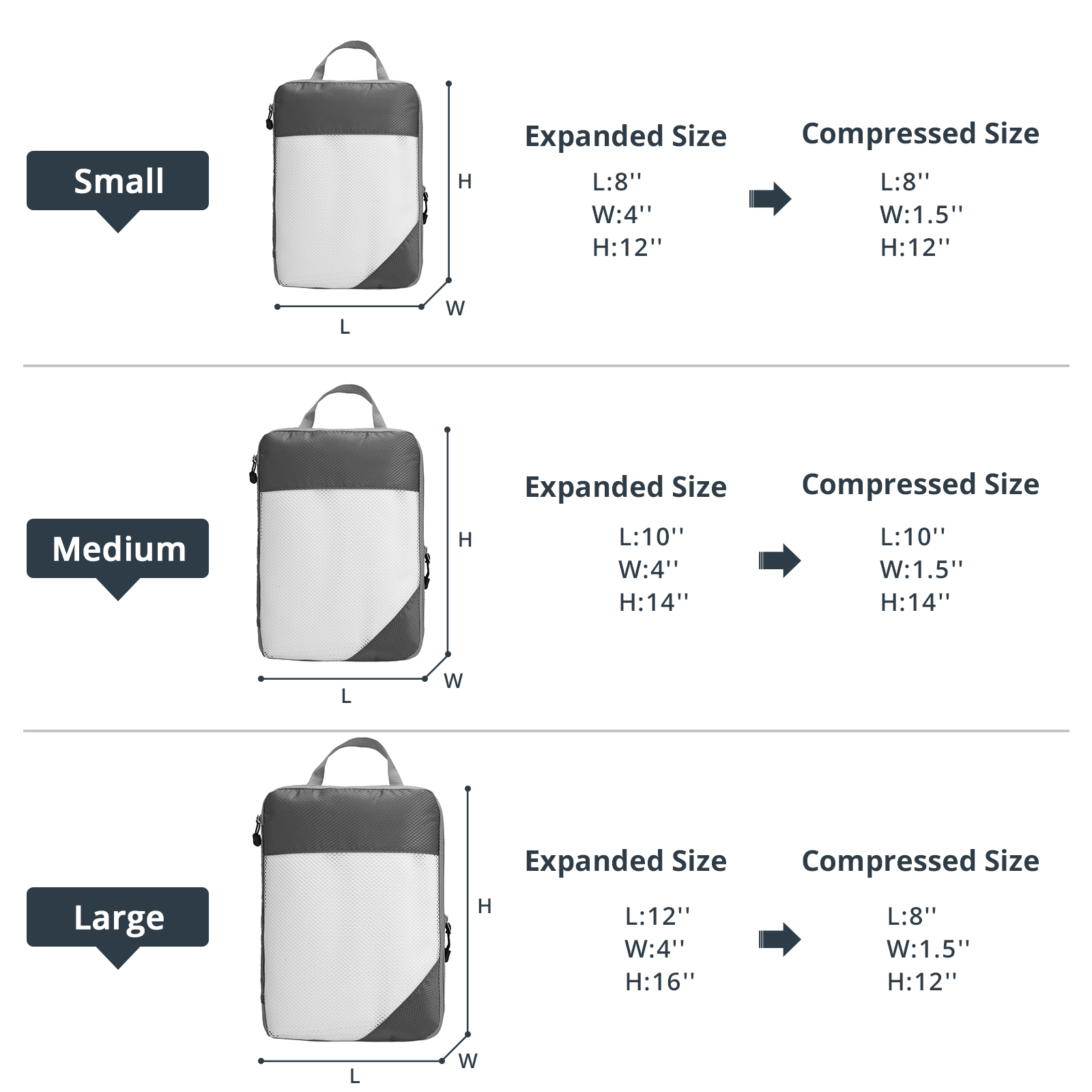 WHAT WILL YOU GET: PACINGCOZY 6 set compression packing cubes for travel including 2 small cubes (12”x8”x4”), 2 medium cubes (14”x10”x4”), 2 large cubes (16”x12”x4”).